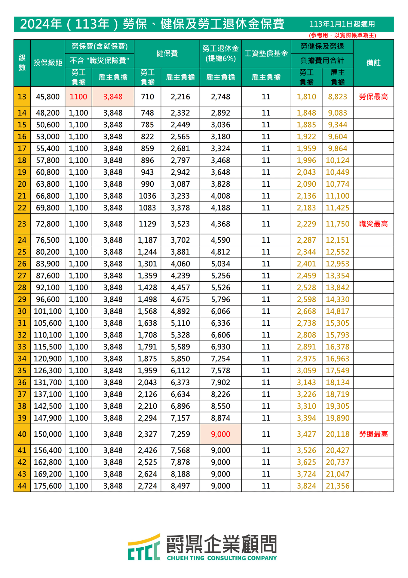 職災保險最高級距為72,800元;勞退提繳級距最高為150,000元。