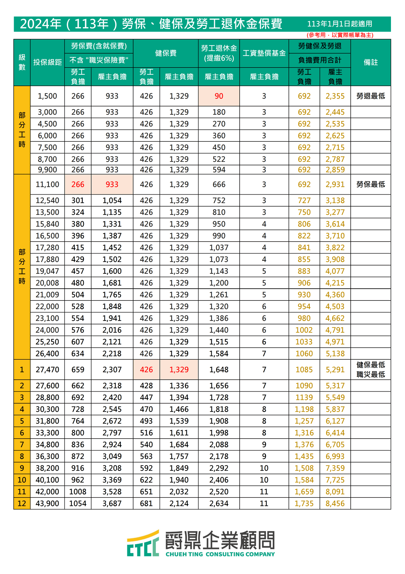 三、勞保投保級距最低為11,100元;健保投保級距最低為27470元;