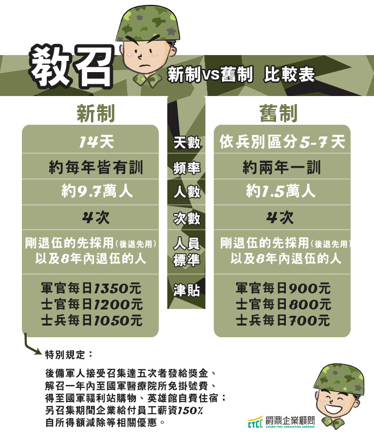 因兩岸衝突情況日益上升,國防部為了加強國軍預備戰力,更改教育召集(簡稱教召)相關規定,不僅教召課程難度提升,教召也從原先5天至7天,上升到14天,以達到充實後備部隊的戰技能力。若員工參加教召,薪資、假別等相關規定,常困擾大家的問題,這邊一次教您看懂 !